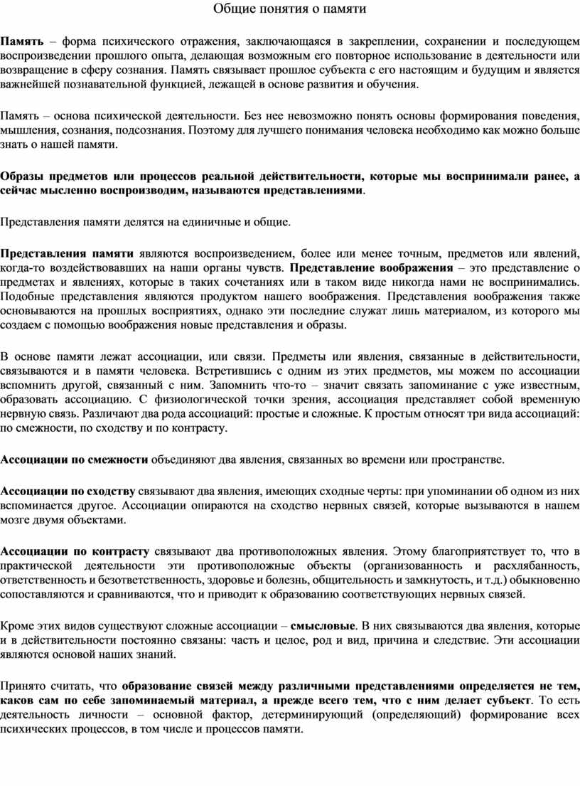 Память – форма психического отражения, заключающаяся в закреплении, сохранении и последующем воспроизведении прошлого опыта, делающая возможным его повторное использование в деятельности или возвращение в сферу сознания. Память связывает прошлое субъекта с его настоящим и будущим и является важнейшей познавательной функцией, лежащей в основе развития и обучения.