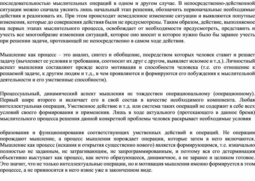 Процессуальный, динамический аспект мышления не тождествен операциональному (операционному). Первый шире второго и включает его в свой состав в качестве необходимого компонента. Любая интеллектуальная операция, Умственное действие и т.д. или система таких операций не содержит в себе всех условий своего формирования и применения. Лишь в ходе актуального (протекающего в данное бремя) мыслительного процесса решения данной конкретной проблемы человек раскрывает необходимые условия