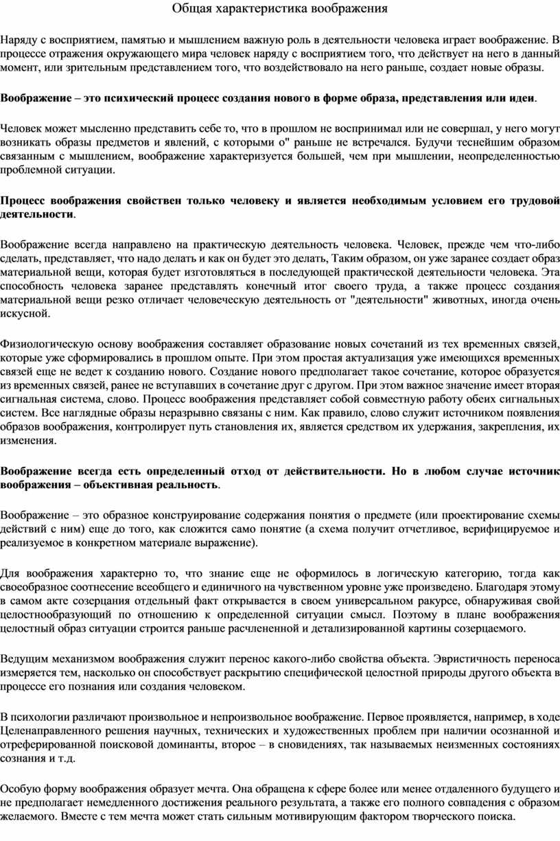 Наряду с восприятием, памятью и мышлением важную роль в деятельности человека играет воображение. В процессе отражения окружающего мира человек наряду с восприятием того, что действует на него в данный момент, или зрительным представлением того, что воздействовало на него раньше, создает новые образы.
