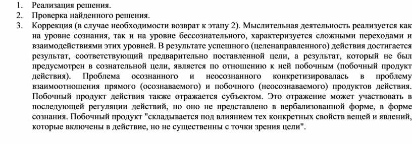 7.       Коррекция (в случае необходимости возврат к этапу 2). Мыслительная деятельность реализуется как на уровне сознания, так и на уровне бессознательного, характеризуется сложными переходами и взаимодействиями этих уровней. В результате успешного (целенаправленного) действия достигается результат, соответствующий предварительно поставленной цели, а результат, который не был предусмотрен в сознательной цели, является по отношению к ней побочным (побочный продукт действия). Проблема осознанного и неосознанного конкретизировалась в проблему взаимоотношения прямого (осознаваемого) и побочного (неосознаваемого) продуктов действия. Побочный продукт действия также отражается субъектом. Это отражение может участвовать в последующей регуляции действий, но оно не представлено в вербализованной форме, в форме сознания. Побочный продукт "складывается под влиянием тех конкретных свойств вещей и явлений, которые включены в действие, но не существенны с точки зрения цели".