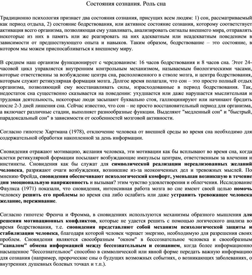 Традиционно психология признает два состояния сознания, присущих всем людям: 1) сон, рассматриваемый как период отдыха, 2) состояние бодрствования, или активное состояние сознания, которому соответствует активация всего организма, позволяющая ему улавливать, анализировать сигналы внешнего мира, отправлять некоторые из них в память или же реагировать на них адекватным или неадекватным поведением в зависимости от предшествующего опыта и навыков. Таким образом, бодрствование – это состояние, в котором мы можем приспосабливаться к внешнему миру.