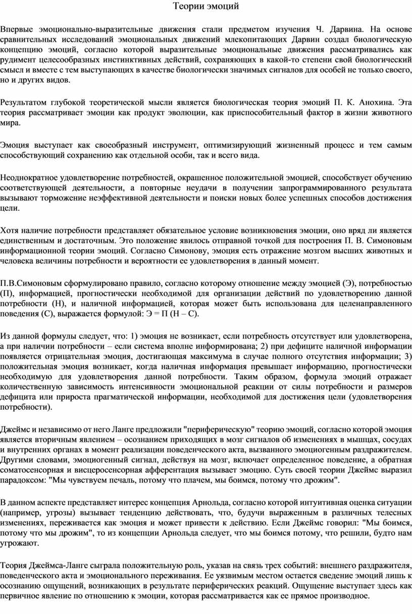 Результатом глубокой теоретической мысли является биологическая теория эмоций П. К. Анохина. Эта теория рассматривает эмоции как продукт эволюции, как приспособительный фактор в жизни животного мира.