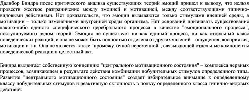 Далибор Биндра после критического анализа существующих теорий эмоций пришел к выводу, что нельзя провести жесткое разграничение между эмоцией и мотивацией, между соответствующими типично-видовыми действиями. Нет доказательств, что эмоции вызываются только стимулами внешней среды, а мотивации – только изменениями внутренней среды организма. Нет оснований признавать существование какого-либо единого специфического церебрального процесса в качестве "эмоционального процесса", постулируемого рядом теорий. Эмоция не существует ни как единый процесс, ни как отдельный класс поведенческих реакций, и она не может быть полностью отделена от других явлений – ощущения, восприятия, мотивации и т.п. Она не является также "промежуточной переменной", связывающей отдельные компоненты поведенческой реакции в целостный акт.