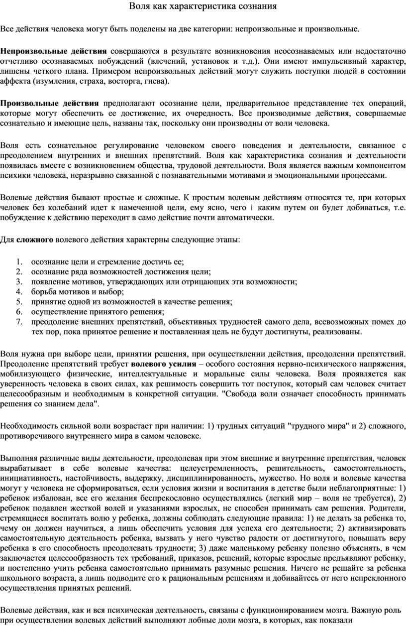 Воля нужна при выборе цели, принятии решения, при осуществлении действия, преодолении препятствий. Преодоление препятствий требует волевого усилия – особого состояния нервно-психического напряжения, мобилизующего физические, интеллектуальные и моральные силы человека. Воля проявляется как уверенность человека в своих силах, как решимость совершить тот поступок, который сам человек считает целесообразным и необходимым в конкретной ситуации. "Свобода воли означает способность принимать решения со знанием дела".