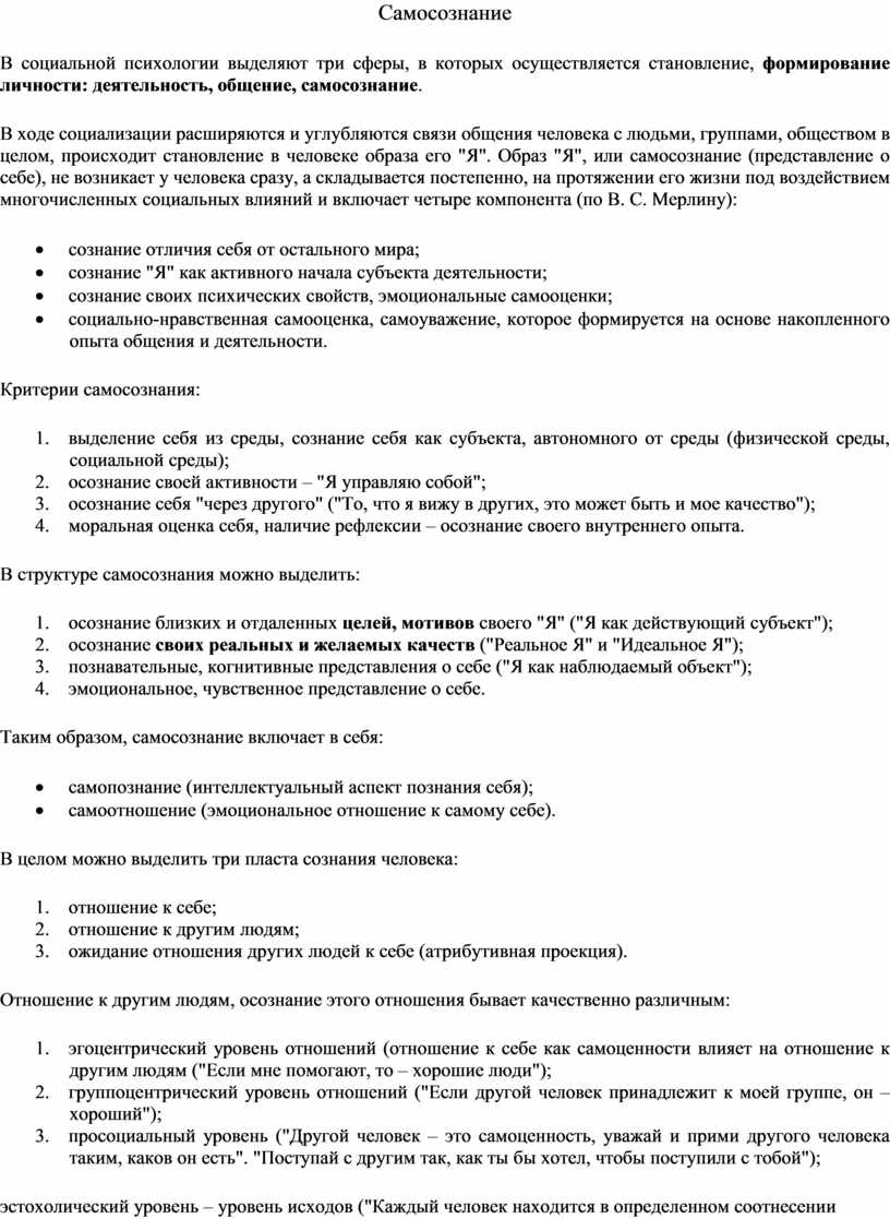 В ходе социализации расширяются и углубляются связи общения человека с людьми, группами, обществом в целом, происходит становление в человеке образа его "Я". Образ "Я", или самосознание (представление о себе), не возникает у человека сразу, а складывается постепенно, на протяжении его жизни под воздействием многочисленных социальных влияний и включает четыре компонента (по В. С. Мерлину):