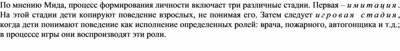 По мнению Мида, процесс формирования личности включает три различные стадии. Первая – имитация. На этой стадии дети копируют поведение взрослых, не понимая его. Затем следует игровая стадия, когда дети понимают поведение как исполнение определенных ролей: врача, пожарного, автогонщика и т.д.; в процессе игры они воспроизводят эти роли.
