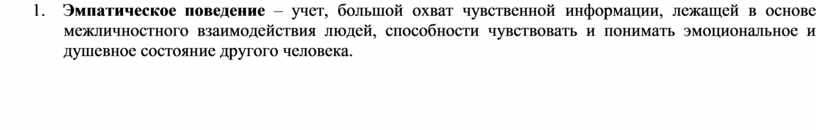 16. Эмпатическое поведение – учет, большой охват чувственной информации, лежащей в основе межличностного взаимодействия людей, способности чувствовать и понимать эмоциональное и душевное состояние другого человека.