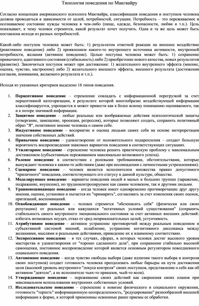 10. Освобождающее поведение – человек стремится "обезопасить себя" (физически или свою репутацию) от реальных или кажущихся "негативных условий существования" (сохранить стабильность своего внутреннего эмоционального состояния за счет активных внешних действий: избегать возможных неудач, отказ от сред непривлекательных целей, уступчивость.