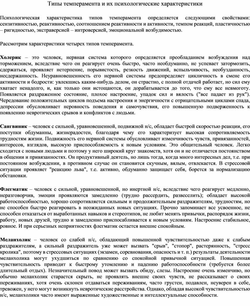 Психологическая характеристика типов темперамента определяется следующими свойствами: сензитивностью, реактивностью, соотношением реактивности и активности, темпом реакций, пластичностью – ригидностью, экстраверсией – интроверсией, эмоциональной возбудимостью.