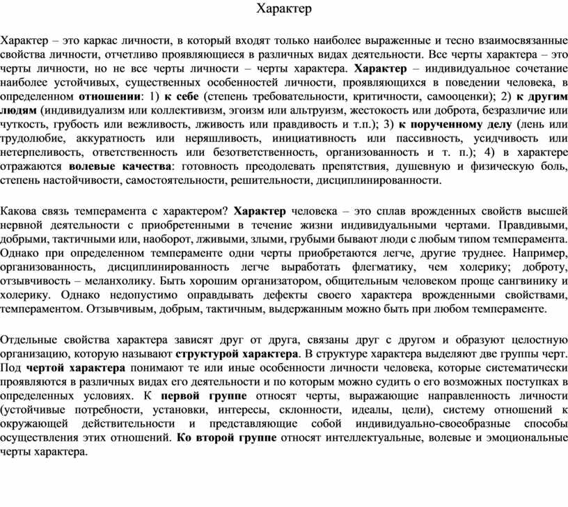 Характер – это каркас личности, в который входят только наиболее выраженные и тесно взаимосвязанные свойства личности, отчетливо проявляющиеся в различных видах деятельности. Все черты характера – это черты личности, но не все черты личности – черты характера. Характер – индивидуальное сочетание наиболее устойчивых, существенных особенностей личности, проявляющихся в поведении человека, в определенном отношении: 1) к себе (степень требовательности, критичности, самооценки); 2) к другим людям (индивидуализм или коллективизм, эгоизм или альтруизм, жестокость или доброта, безразличие или чуткость, грубость или вежливость, лживость или правдивость и т.п.); 3) к порученному делу (лень или трудолюбие, аккуратность или неряшливость, инициативность или пассивность, усидчивость или нетерпеливость, ответственность или безответственность, организованность и т. п.); 4) в характере отражаются волевые качества: готовность преодолевать препятствия, душевную и физическую боль, степень настойчивости, самостоятельности, решительности, дисциплинированности.