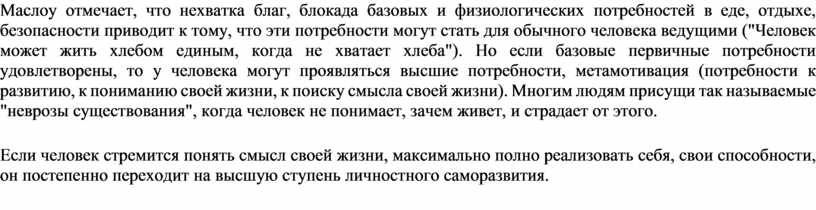Маслоу отмечает, что нехватка благ, блокада базовых и физиологических потребностей в еде, отдыхе, безопасности приводит к тому, что эти потребности могут стать для обычного человека ведущими ("Человек может жить хлебом единым, когда не хватает хлеба"). Но если базовые первичные потребности удовлетворены, то у человека могут проявляться высшие потребности, метамотивация (потребности к развитию, к пониманию своей жизни, к поиску смысла своей жизни). Многим людям присущи так называемые "неврозы существования", когда человек не понимает, зачем живет, и страдает от этого.