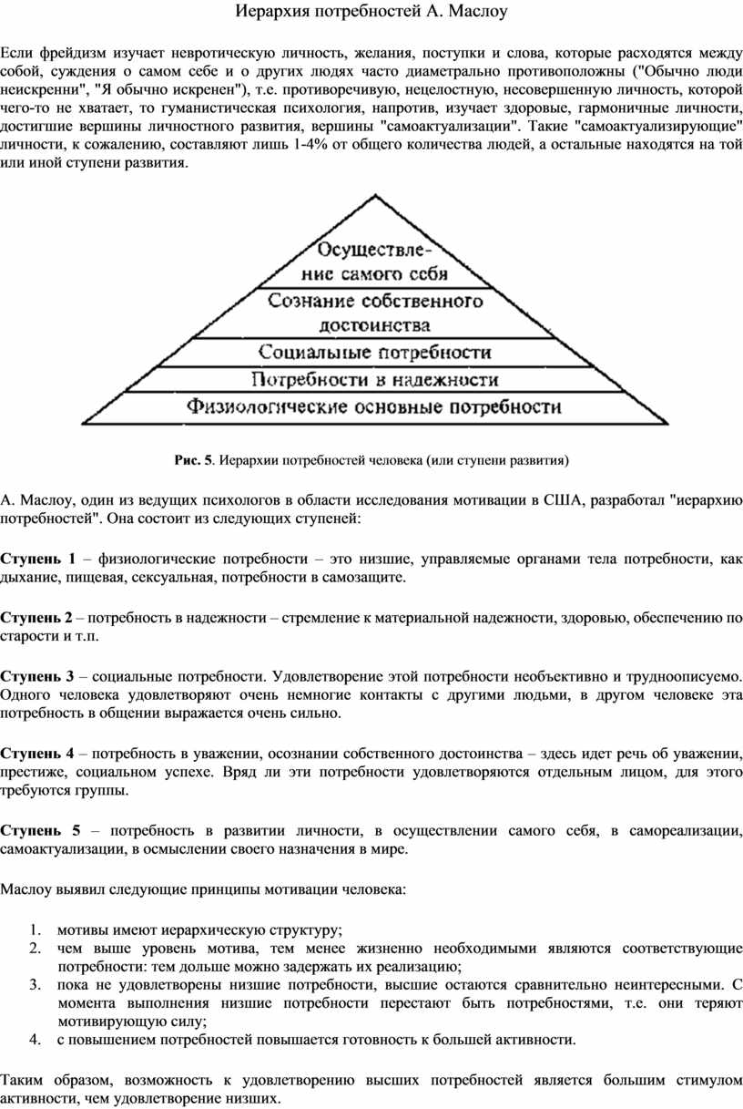 А. Маслоу, один из ведущих психологов в области исследования мотивации в США, разработал "иерархию потребностей". Она состоит из следующих ступеней: