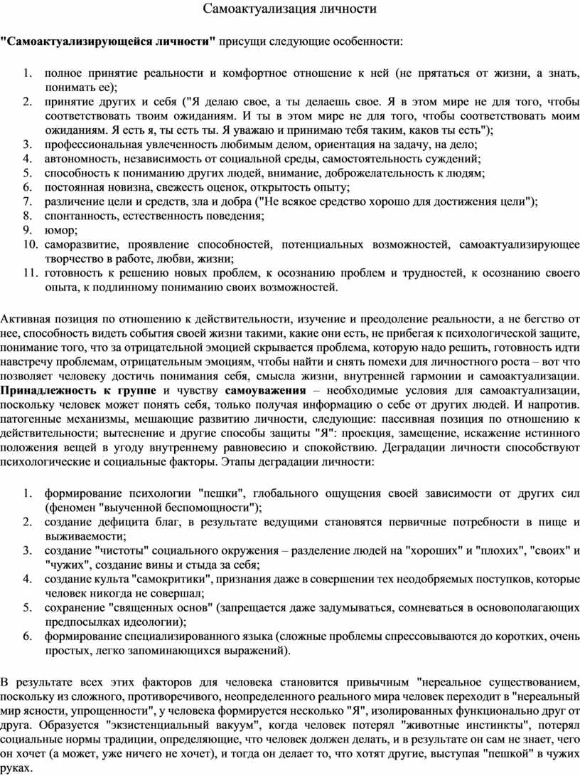 Активная позиция по отношению к действительности, изучение и преодоление реальности, а не бегство от нее, способность видеть события своей жизни такими, какие они есть, не прибегая к психологической защите, понимание того, что за отрицательной эмоцией скрывается проблема, которую надо решить, готовность идти навстречу проблемам, отрицательным эмоциям, чтобы найти и снять помехи для личностного роста – вот что позволяет человеку достичь понимания себя, смысла жизни, внутренней гармонии и самоактуализации. Принадлежность к группе и чувству самоуважения – необходимые условия для самоактуализации, поскольку человек может понять себя, только получая информацию о себе от других людей. И напротив. патогенные механизмы, мешающие развитию личности, следующие: пассивная позиция по отношению к действительности; вытеснение и другие способы защиты "Я": проекция, замещение, искажение истинного положения вещей в угоду внутреннему равновесию и спокойствию. Деградации личности способствуют психологические и социальные факторы. Этапы деградации личности: