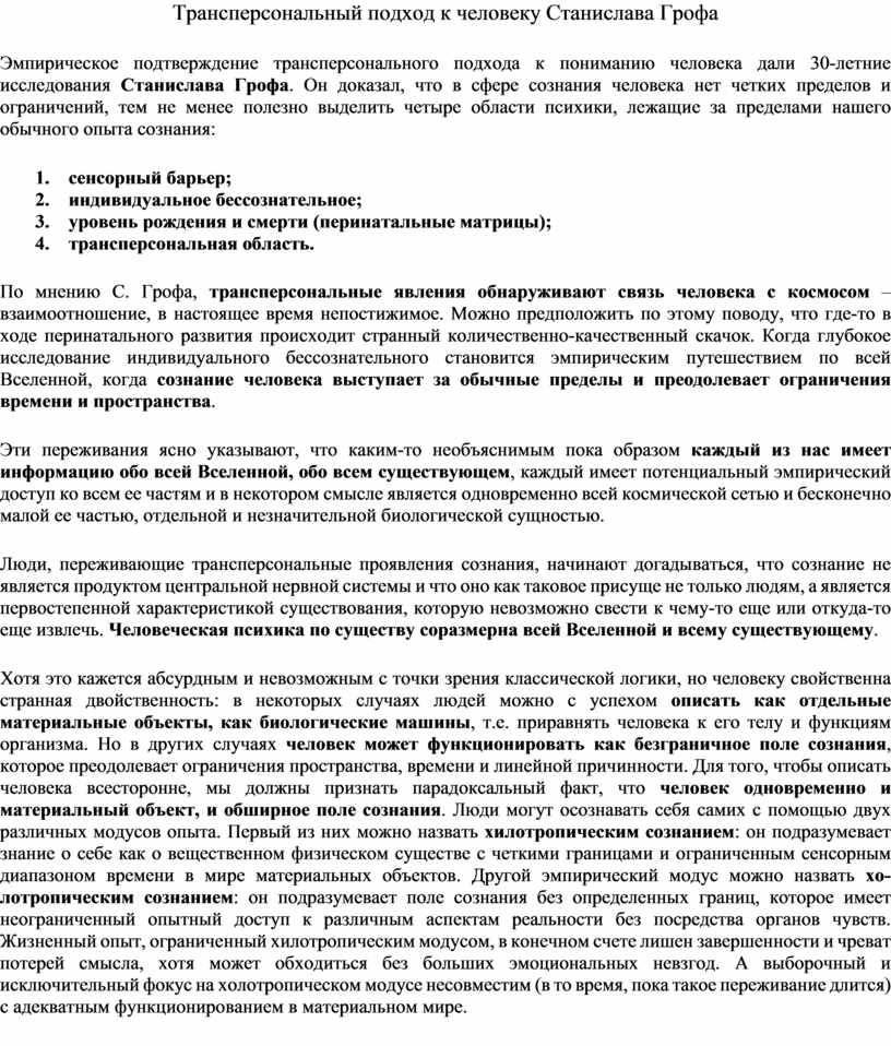 Эмпирическое подтверждение трансперсонального подхода к пониманию человека дали 30-летние исследования Станислава Грофа. Он доказал, что в сфере сознания человека нет четких пределов и ограничений, тем не менее полезно выделить четыре области психики, лежащие за пределами нашего обычного опыта сознания: