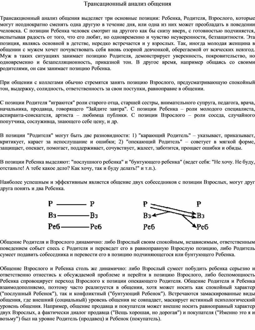 Трансакционный анализ общения выделяет три основные позиции: Ребенка, Родителя, Взрослого, которые могут неоднократно сменять одна другую в течение дня, или одна из них может преобладать в поведении человека. С позиции Ребенка человек смотрит на другого как бы снизу вверх, с готовностью подчиняется, испытывая радость от того, что его любят, но одновременно и чувство неуверенности, беззащитности. Эта позиция, являясь основной в детстве, нередко встречается и у взрослых. Так, иногда молодая женщина в общении с мужем хочет почувствовать себя вновь озорной девчонкой, оберегаемой от всяческих невзгод. Муж в таких ситуациях занимает позицию Родителя, демонстрирует уверенность, покровительство, но одновременно и безапелляционность, приказной тон. В другое время, например общаясь со своими родителями, он сам занимает позицию Ребенка.