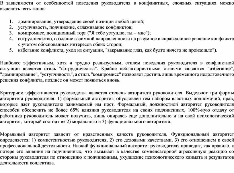 В зависимости от особенностей поведения руководителя в конфликтных, сложных ситуациях можно выделить пять типов: