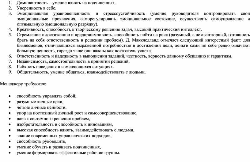 5. Стремление к достижению и предприимчивость, способность пойти на риск (разумный, а не авантюрный, готовность брать на себя ответственность в решении проблем). Д. Макклелланд отмечает следующий интересный факт: для бизнесменов, отличающихся выраженной потребностью в достижении цели, деньги сами по себе редко означают большую ценность, гораздо чаще они важны как показатель успеха.
