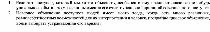 3. Неверное объяснение поступков людей имеет место тогда, когда есть много различных, равновероятностных возможностей для их интерпретации и человек, предлагающий свое объяснение, волен выбирать устраивающий его вариант.
