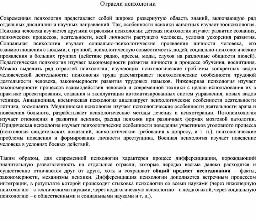 Таким образом, для современной психологии характерен процесс дифференциации, порождающий значительную разветвленность на отдельные отрасли, которые нередко весьма далеко расходятся и существенно отличаются друг от друга, хотя и сохраняют общий предмет исследования – факты, закономерности, механизмы психики. Дифференциация психологии дополняется встречным процессом интеграции, в результате которой происходит стыковка психологии со всеми науками (через инженерную психологию – с техническими науками, через педагогическую психологию – с педагогикой, через социальную психологию – с общественными и социальными науками и т. д.).