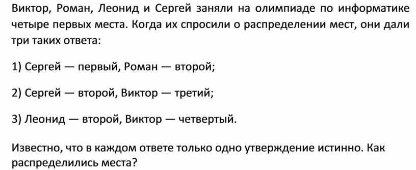 Виктор, Роман, Леонид и Сергей заняли на олимпиаде по информатике четыре первых места. Когда их спросили о распределении мест, они дали три таких ответа: