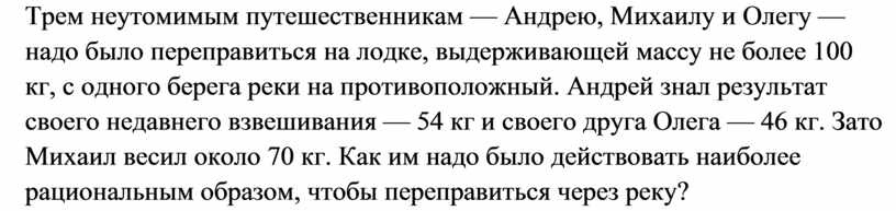 Трем неутомимым путешественникам — Андрею, Михаилу и Олегу — надо было переправиться на лодке, выдерживающей массу не более 100 кг, с одного берега реки на противоположный. Андрей знал результат своего недавнего взвешивания — 54 кг и своего друга Олега — 46 кг. Зато Михаил весил около 70 кг. Как им надо было действовать наиболее рациональным образом, чтобы переправиться через реку?