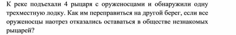 К реке подъехали 4 рыцаря с оруженосцами и обнаружили одну трехместную лодку. Как им переправиться на другой берег, если все оруженосцы наотрез отказались оставаться в обществе незнакомых рыцарей?