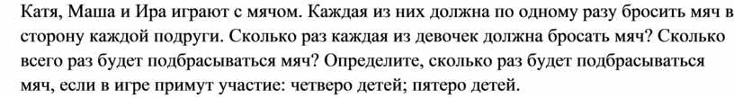 Катя, Маша и Ира играют с мячом. Каждая из них должна по одному разу бросить мяч в сторону каждой подруги. Сколько раз каждая из девочек должна бросать мяч? Сколько всего раз будет подбрасываться мяч? Определите, сколько раз будет подбрасываться мяч, если в игре примут участие: четверо детей; пятеро детей.