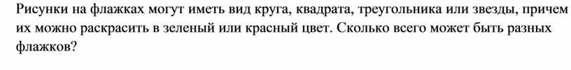 Рисунки на флажках могут иметь вид круга, квадрата, треугольника или звезды, причем их можно раскрасить в зеленый или красный цвет. Сколько всего может быть разных флажков?