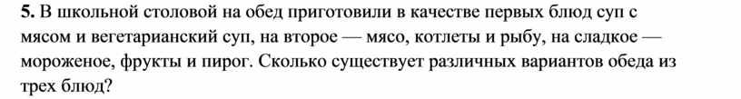 5. В школьной столовой на обед приготовили в качестве первых блюд суп с мясом и вегетарианский суп, на второе — мясо, котлеты и рыбу, на сладкое — мороженое, фрукты и пирог. Сколько существует различных вариантов обеда из трех блюд?