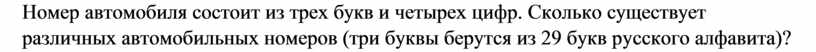Номер автомобиля состоит из трех букв и четырех цифр. Сколько существует различных автомобильных номеров (три буквы берутся из 29 букв русского алфавита)?