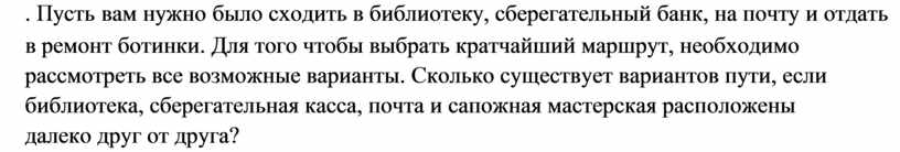 в ремонт ботинки. Для того чтобы выбрать кратчайший маршрут, необходимо рассмотреть все возможные варианты. Сколько существует вариантов пути, если библиотека, сберегательная касса, почта и сапожная мастерская расположены далеко друг от друга?