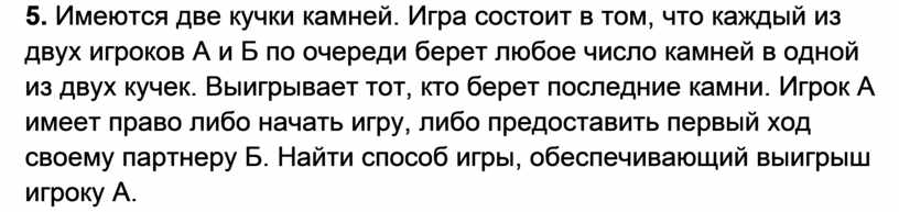 5. Имеются две кучки камней. Игра состоит в том, что каждый из двух игроков А и Б по очереди берет любое число камней в одной из двух кучек. Выигрывает тот, кто берет последние камни. Игрок А имеет право либо начать игру, либо предоставить первый ход своему партнеру Б. Найти способ игры, обеспечивающий выигрыш игроку А.