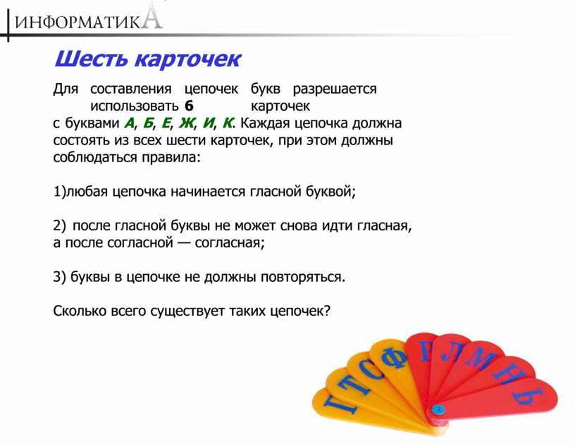 с буквами А, Б, Е, Ж, И, К. Каждая цепочка должна состоять из всех шести карточек, при этом должны соблюдаться правила: