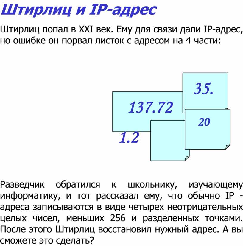 Штирлиц попал в XXI век. Ему для связи дали IP-адрес, но ошибке он порвал листок с адресом на 4 части: