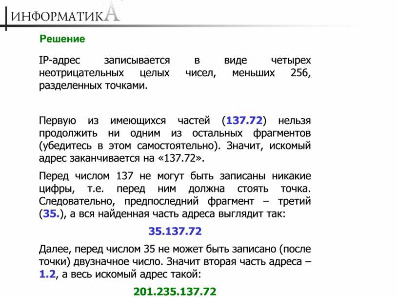 Перед числом 137 не могут быть записаны никакие цифры, т.е. перед ним должна стоять точка. Следовательно, предпоследний фрагмент – третий (35.), а вся найденная часть адреса выглядит так: