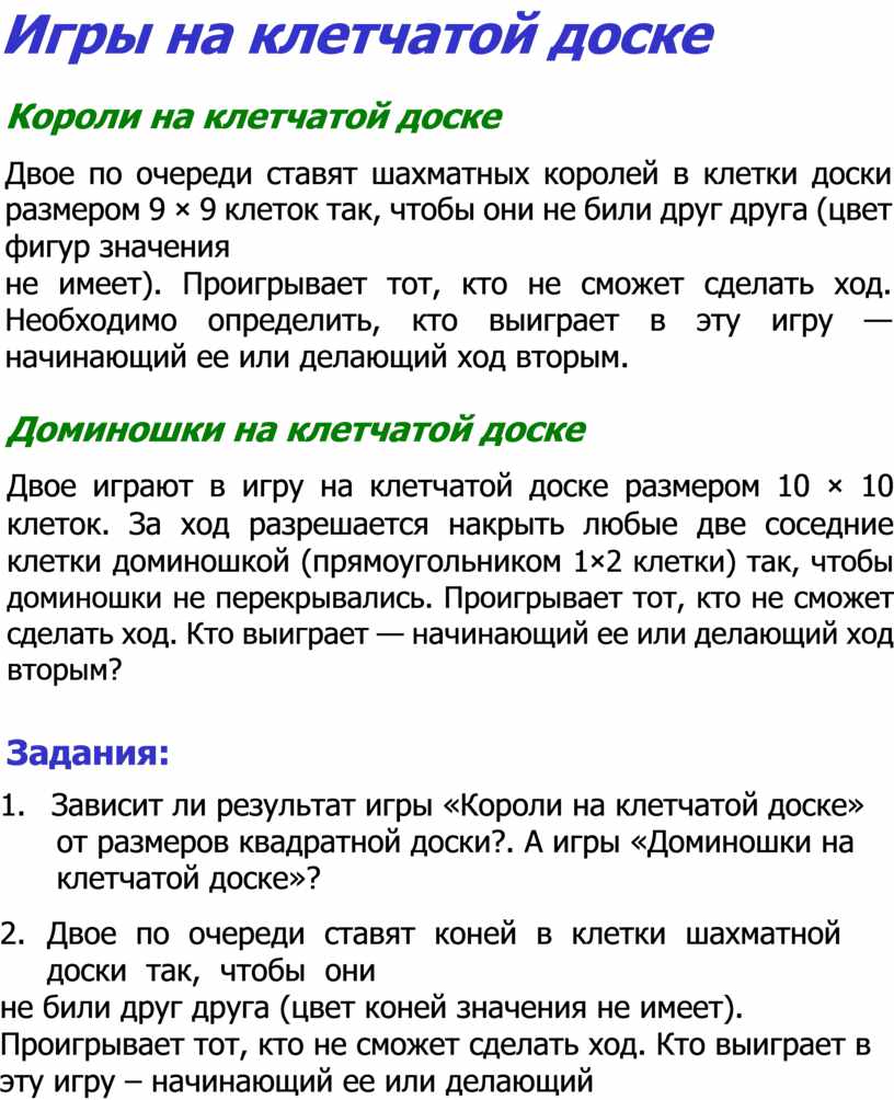 1. Зависит ли результат игры «Короли на клетчатой доске» от размеров квадратной доски?. А игры «Доминошки на клетчатой доске»?