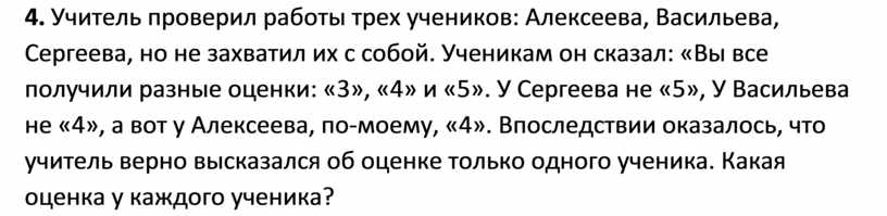4. Учитель проверил работы трех учеников: Алексеева, Васильева, Сергеева, но не захватил их с собой. Ученикам он сказал: «Вы все получили разные оценки: «3», «4» и «5». У Сергеева не «5», У Васильева не «4», а вот у Алексеева, по-моему, «4». Впоследствии оказалось, что учитель верно высказался об оценке только одного ученика. Какая оценка у каждого ученика?