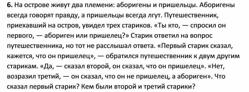 6. На острове живут два племени: аборигены и пришельцы. Аборигены всегда говорят правду, а пришельцы всегда лгут. Путешественник, приехавший на остров, увидел трех стариков. «Ты кто, — спросил он первого, — абориген или пришелец?» Старик ответил на вопрос путешественника, но тот не расслышал ответа. «Первый старик сказал, кажется, что он пришелец», — обратился путешественник к двум другим старикам. «Да, — сказал второй, он сказал, что он пришелец». «Нет, возразил третий, — он сказал, что он не пришелец, а абориген». Что сказал первый старик? Кем были второй и третий старики?
