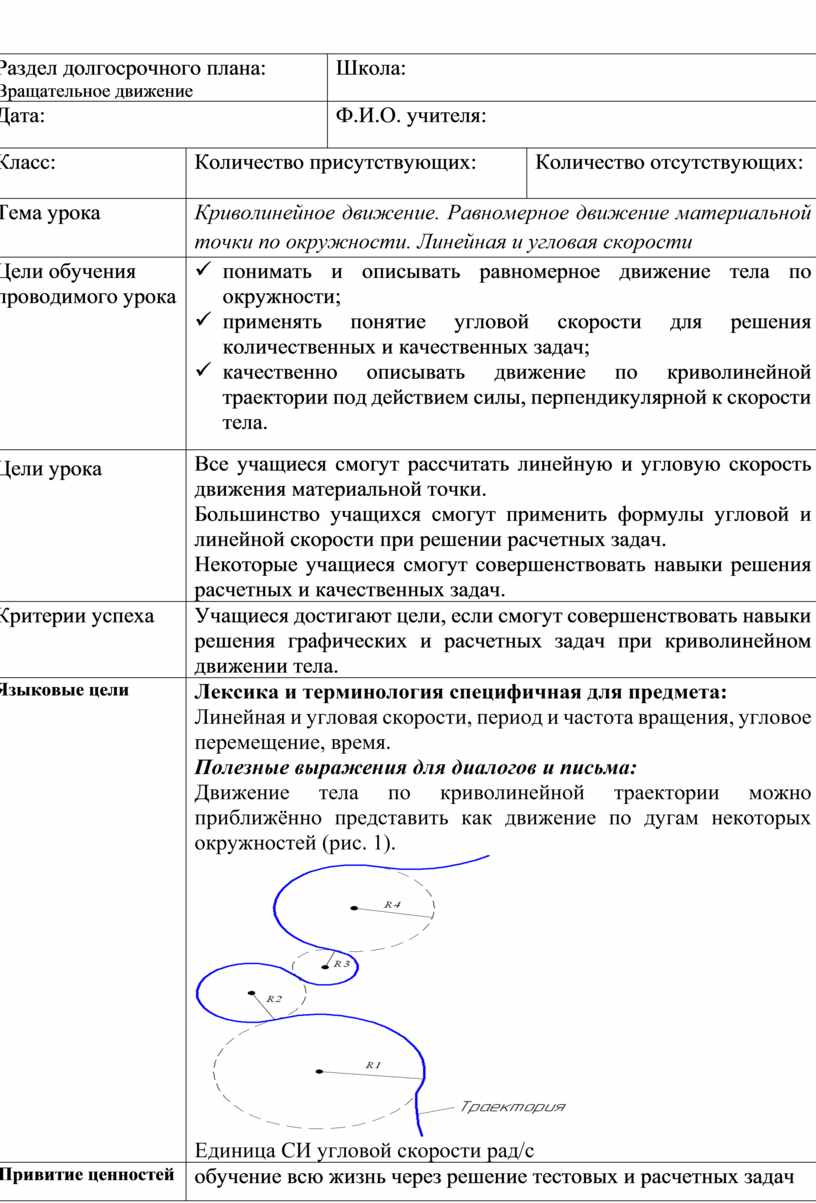 Лексика и терминология специфичная для предмета: Линейная и угловая скорости, период и частота вращения, угловое перемещение, время. Полезные выражения для диалогов и письма: Движение тела по криволинейной траектории можно приближённо представить как движение по дугам некоторых окружностей (рис. 1).