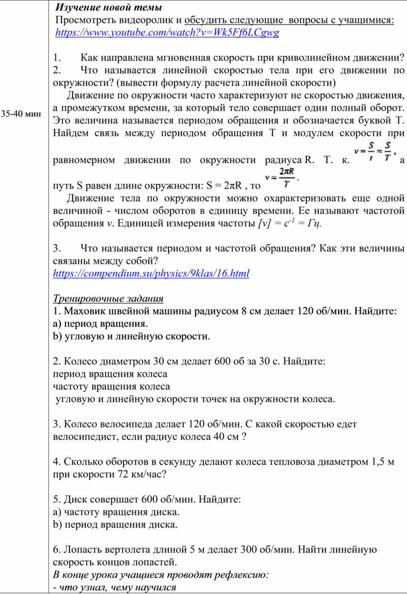 6. Лопасть вертолета длиной 5 м делает 300 об/мин. Найти линейную скорость концов лопастей. В конце урока учащиеся проводят рефлексию: - что узнал, чему научился - что осталось непонятным - над чем необходимо работать
