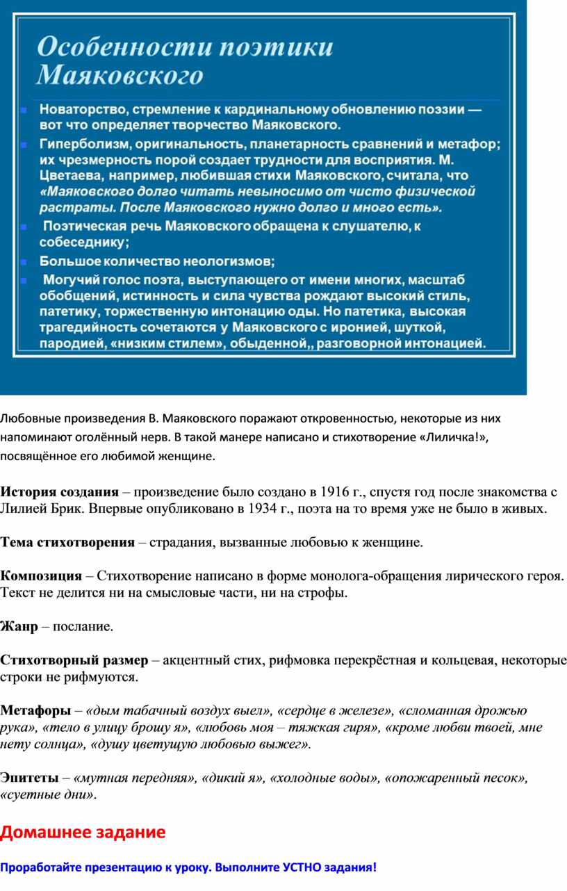 Любовные произведения В. Маяковского поражают откровенностью, некоторые из них напоминают оголённый нерв. В такой манере написано и стихотворение «Лиличка!», посвящённое его любимой женщине.