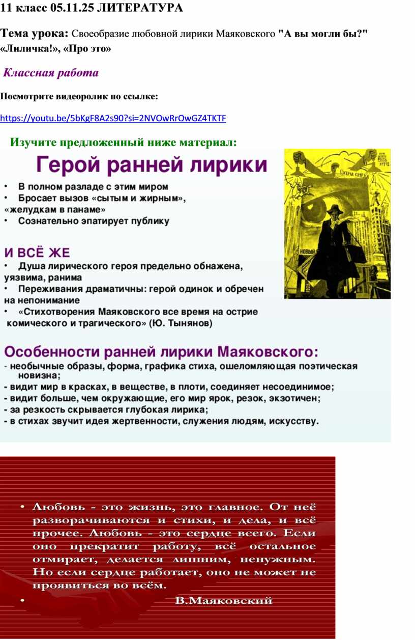 Тема урока: Своеобразие любовной лирики Маяковского "А вы могли бы?" «Лиличка!», «Про это»