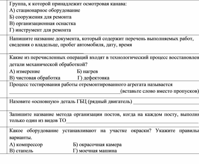 Группа, к которой принадлежит осмотровая канава: А) стационарное оборудование Б) сооружения для ремонта В) организационная оснастка Г) инструмент для ремонта |