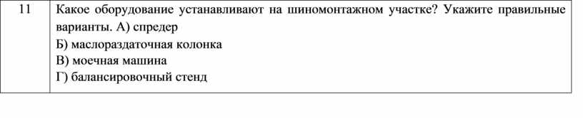 Какое оборудование устанавливают на шиномонтажном участке? Укажите правильные варианты. А) спредер Б) маслораздаточная колонка В) моечная машина Г) балансировочный стенд |