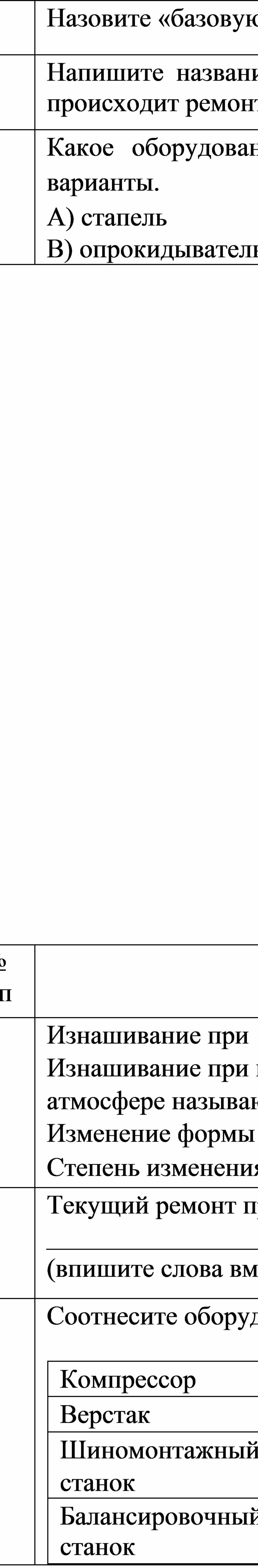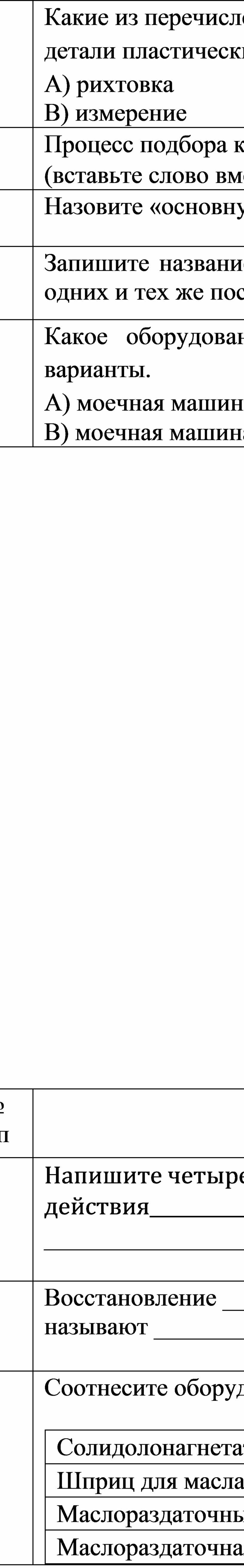 Изнашивание в виде пятен, канавок, возникающее в среде жидкости или газа называют ________________________________________________ Изнашивание при окислении металлов называют ____________________ Изнашивание при соприкосновении тел в условиях малых колебаний называют ______________________________________________________ Изнашивание в результате схватывания и глубинного вырывания материала называют __________________________________________ (впишите слова вместо пропусков) |
