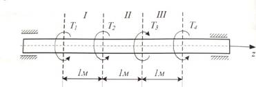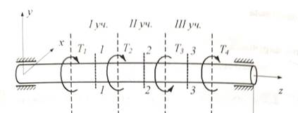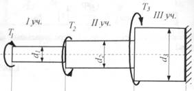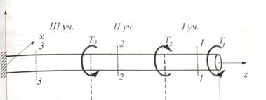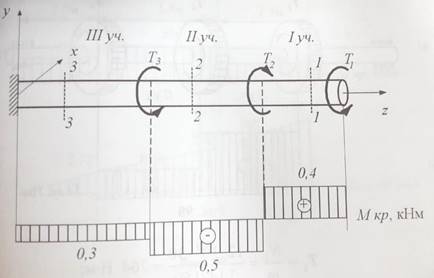 а) Вал нагружен сосредоточенными моментами Т1 =0,4 кН·м; Т2 =0,9 кН·м; Т3 =0,2 кН·м, применяя метод сечений определить крутящий момент на каждом участке; б) Указать номер наиболее нагруженного участка и значение Мкр на нем; (ответ записать через запятую, в виде двух чисел)