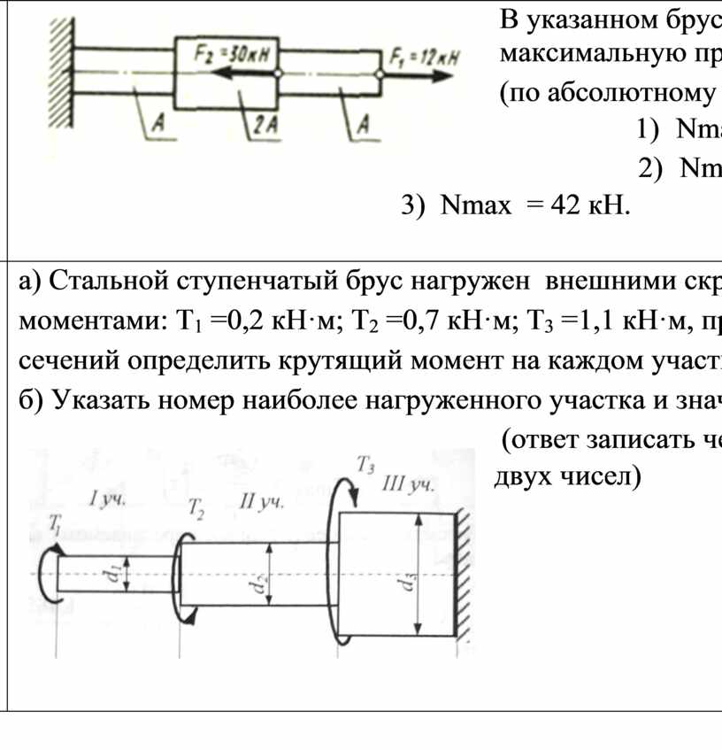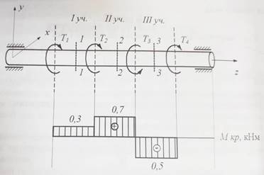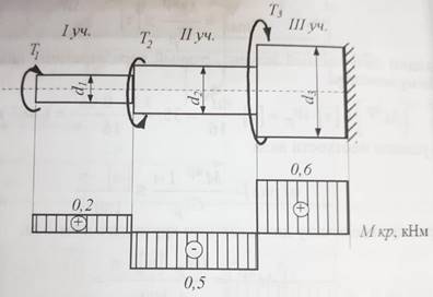 а) Стальной ступенчатый брус нагружен внешними скручивающими моментами: Т1 =0,2 кН·м; Т2 =0,7 кН·м; Т3 =1,1 кН·м, применяя метод сечений определить крутящий момент на каждом участке; б) Указать номер наиболее нагруженного участка и значение Мкр на нем;