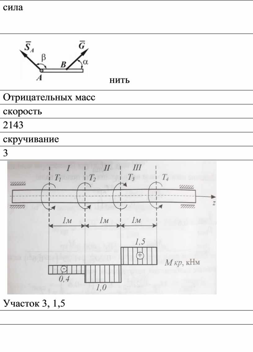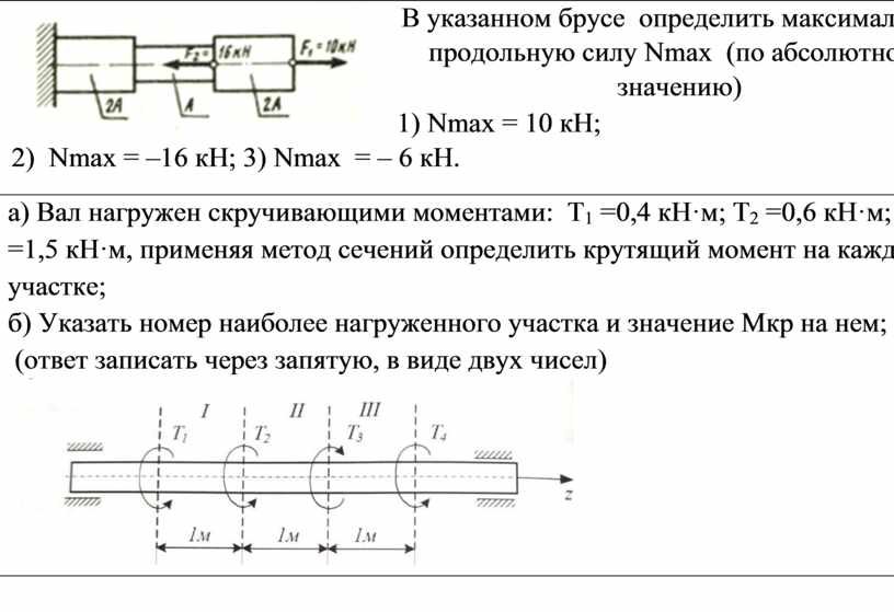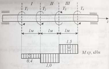 а) Вал нагружен скручивающими моментами: Т1 =0,4 кН·м; Т2 =0,6 кН·м; Т4 =1,5 кН·м, применяя метод сечений определить крутящий момент на каждом участке; б) Указать номер наиболее нагруженного участка и значение Мкр на нем; (ответ записать через запятую, в виде двух чисел)