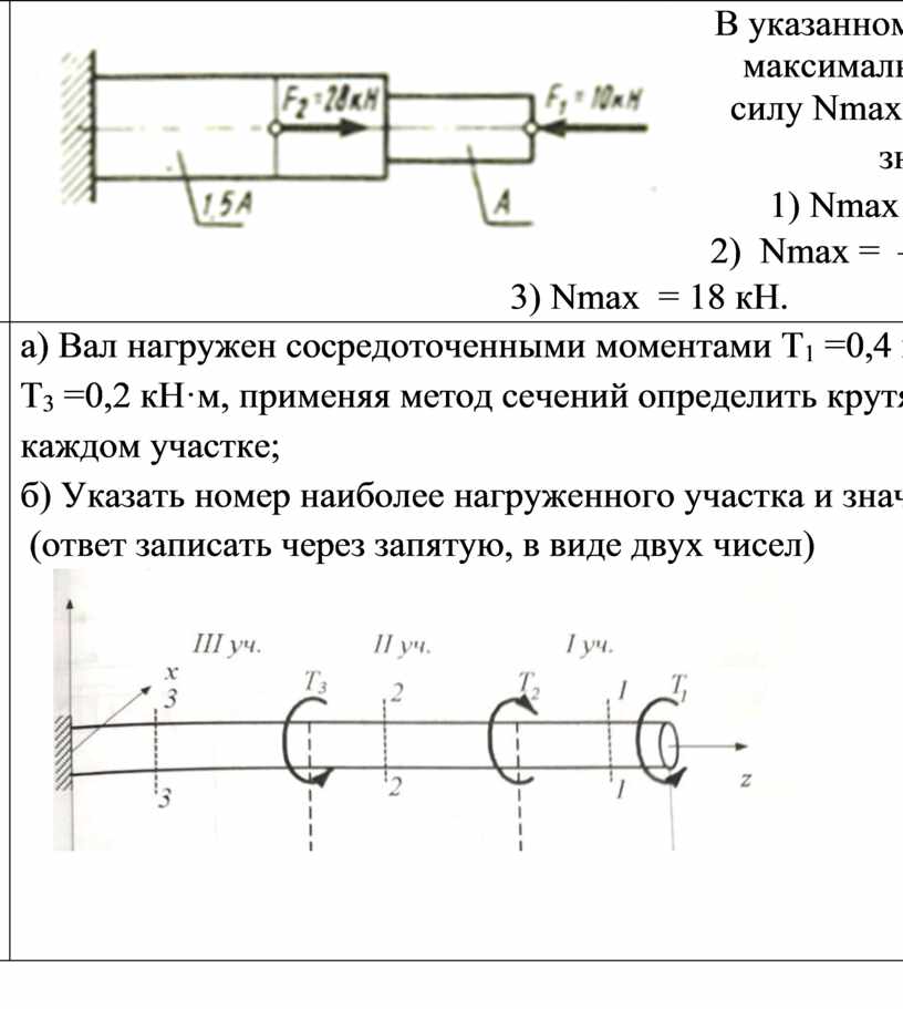 силу Nmax (по абсолютному значению) 1) Nmax = 28 кН; 2) Nmax = – 10 кН; 3) Nmax = 18 кН. |