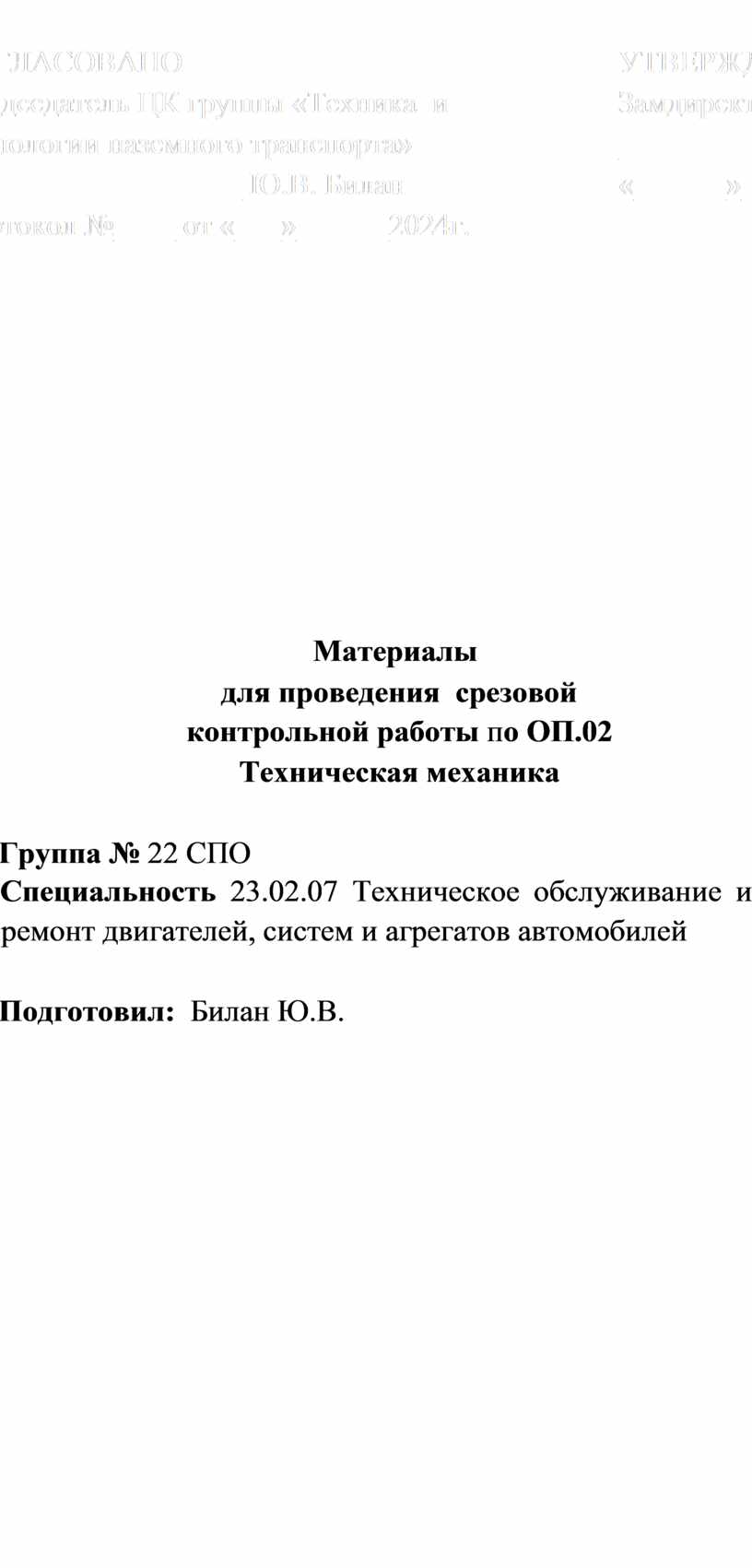 СОГЛАСОВАНО Председатель ЦК группы «Техника и технологии наземного транспорта» ___________________ Ю.В. Билан Протокол №____ от «___»______2024г.